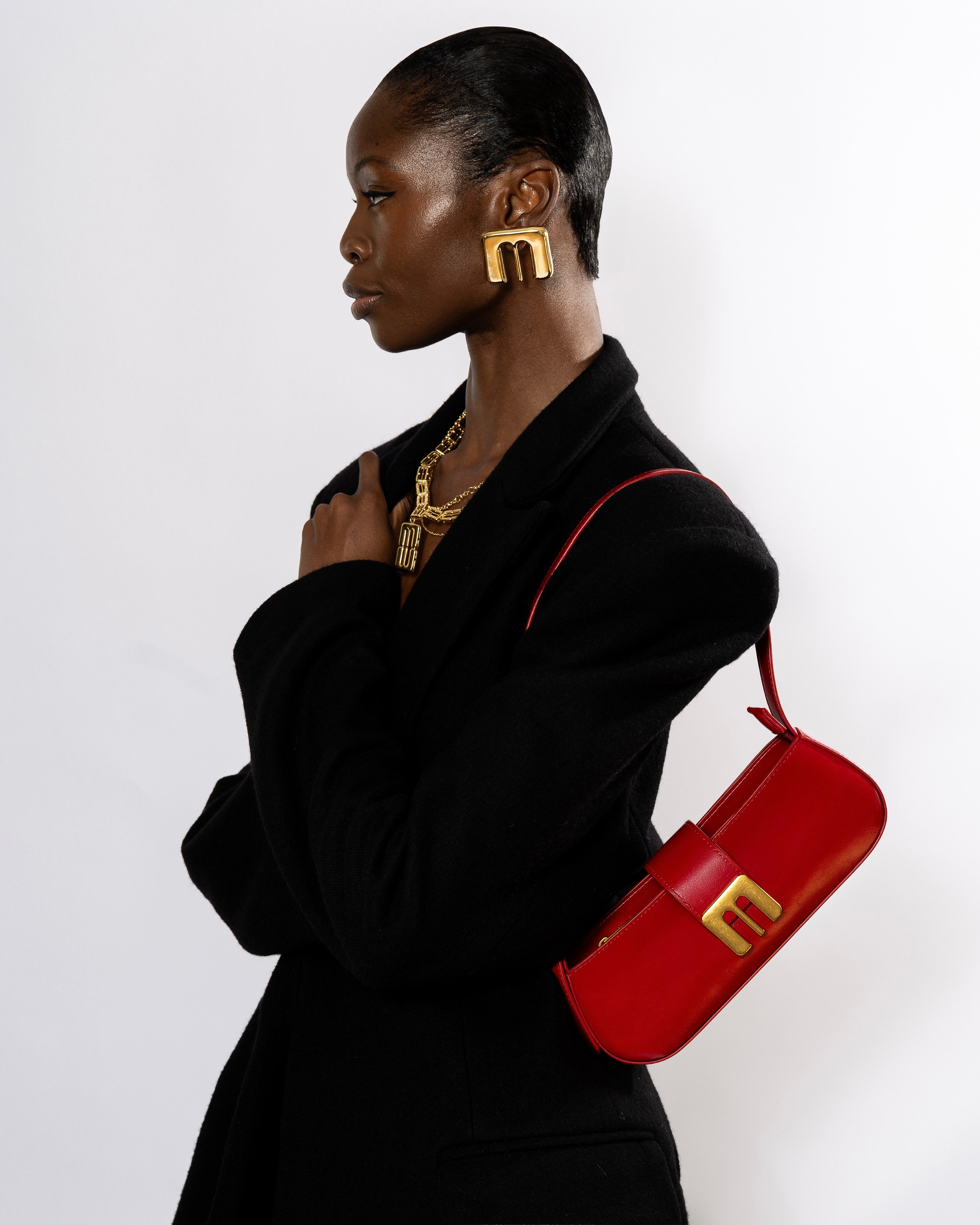 The Gabby bag features the recognizable M motif, brass hardware, and a sleek silhouette. This is a small bag made with oily vegan leather. The Gabby bag carries an iPhone and other small essentials making it perfect for a special night out or everyday use.